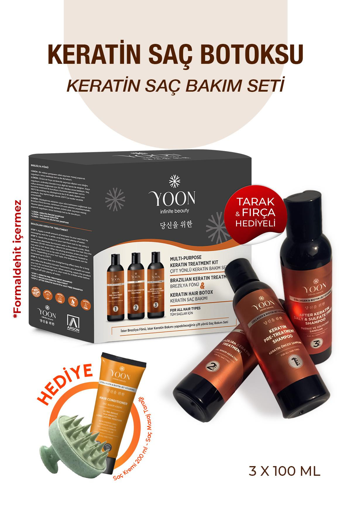 - Tüm saç tipleri için uygun olan bu set, herkesin kullanımına açık olup, saçların ihtiyaç duyduğu bakımı sağlamaktadır.; - Besleyici ve onarıcı etkiye sahip olan YOON Keratin Öncesi Şampuan, keratinin saç üzerindeki etkisini maksimize eder ve onarıcı süreci başlatır.; - YOON Saç Bakım Keratini, saçları derinlemesine beslerken aynı zamanda onararak daha sağlıklı ve parlak bir görünüm kazandırır.; - Tuzsuz ve sülfatsız formülüyle saçları yıpratmadan temizler ve parlaklık kazandırır; keratin işleminden en az 24 saat sonra uygulanması önerilir.